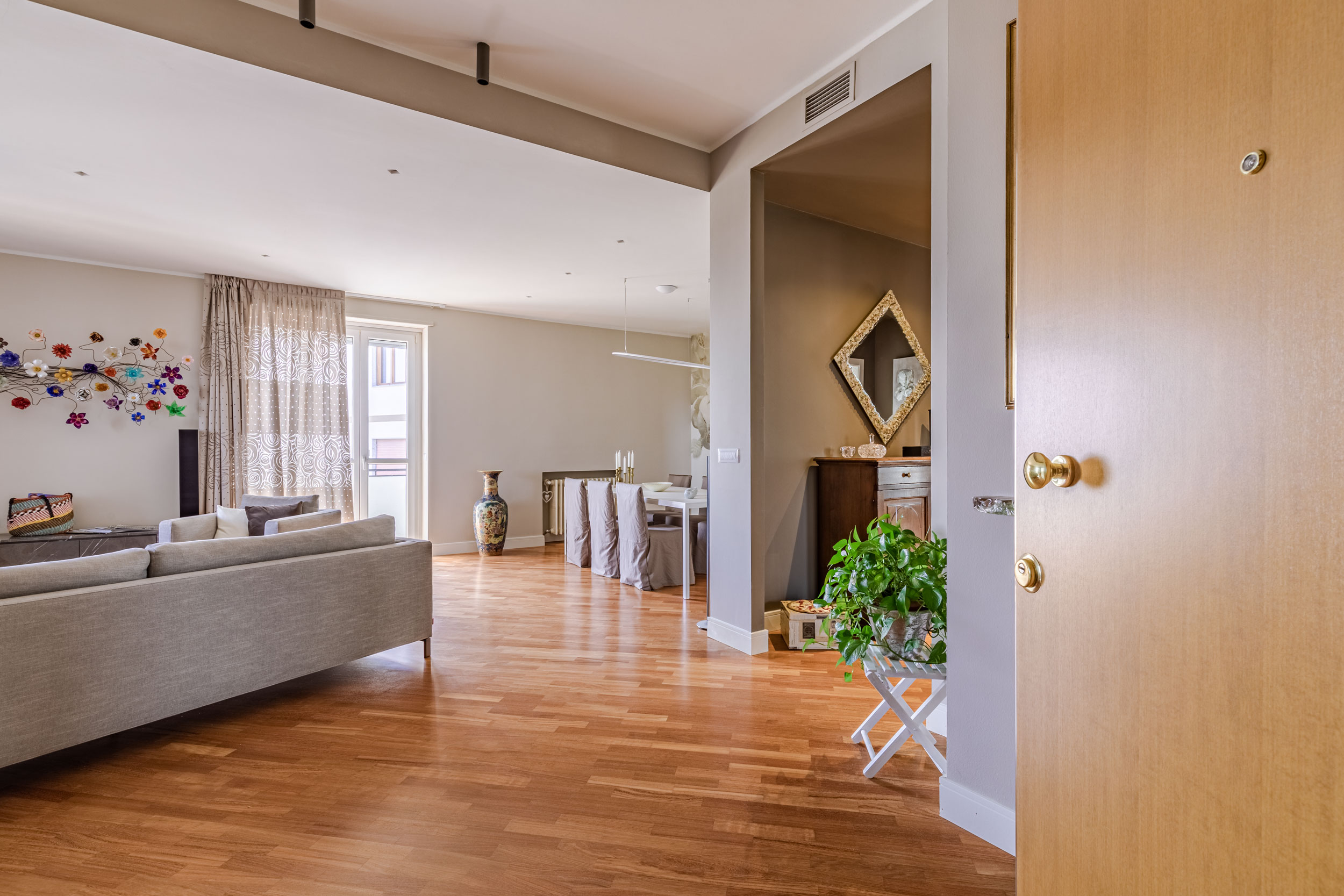 All’ultimo piano di un edificio costruito tra gli anni ’60 e ’70, un attico di circa 150 mq è stato oggetto di una ristrutturazione radicale.