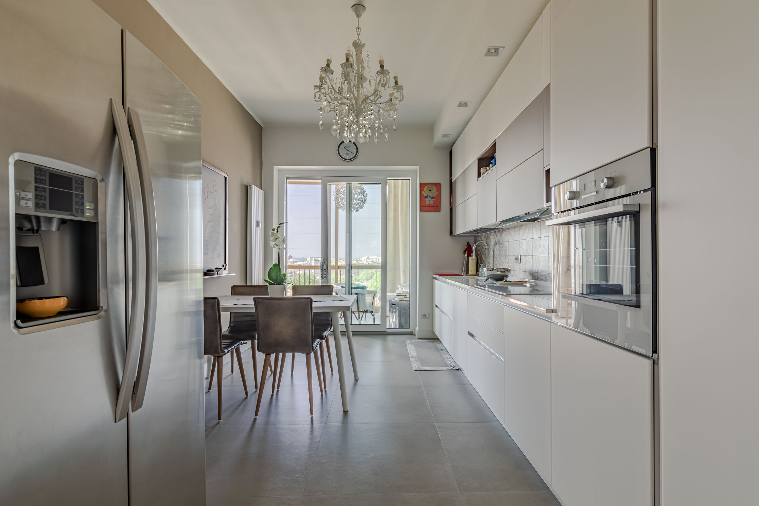 Il terrazzo prospiciente la cucina è stato pensato come estensione dell’abitare, ospitando una zona pranzo e relax all’aperto, in dialogo con l’interno.