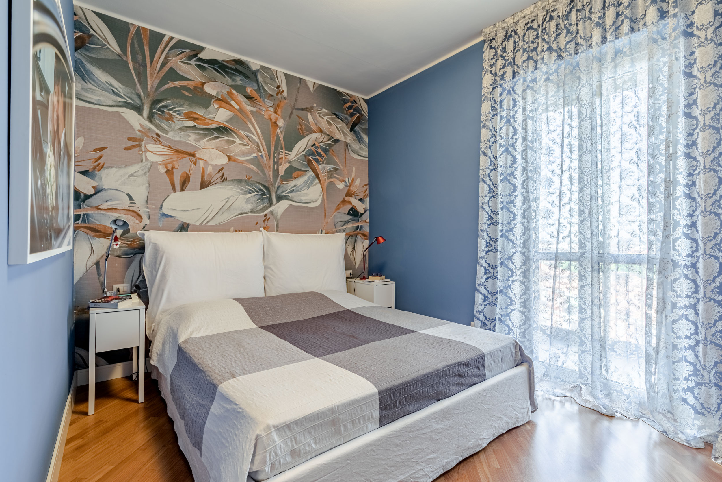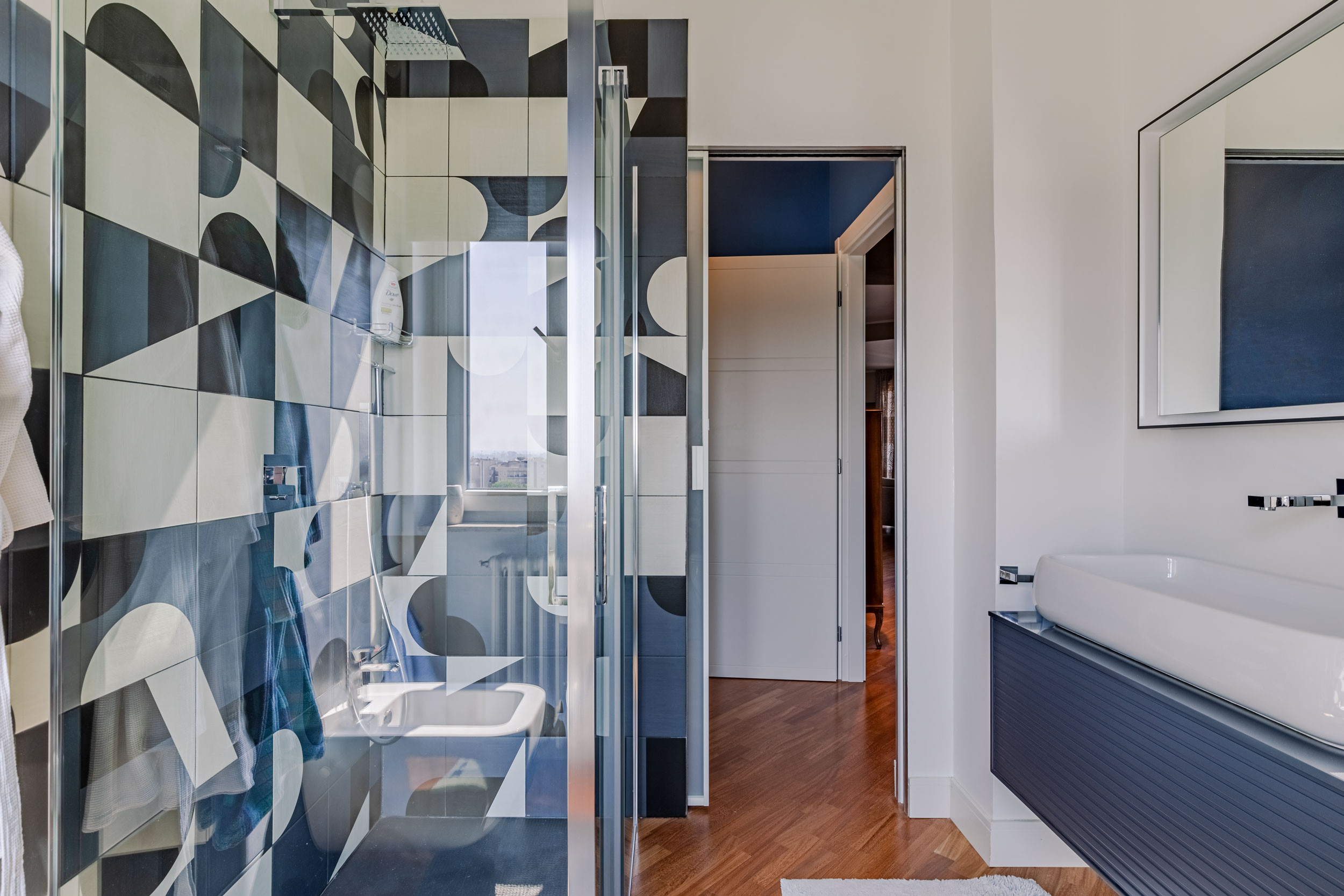 Grande attenzione è stata riservata alla scelta dei materiali e delle finiture, con un linguaggio coerente e sensibile: carte da parati floreali nella zona pranzo e nelle camere, rivestimenti ceramici astratti nei bagni, e il ripristino dei pavimenti lignei originali, integrati dove necessario. Le porte interne, sono state selezionate per la loro capacità di dialogare con l’interior: scorrevoli a scomparsa per ottimizzare gli spazi e battenti coordinate per continuità stilistica.